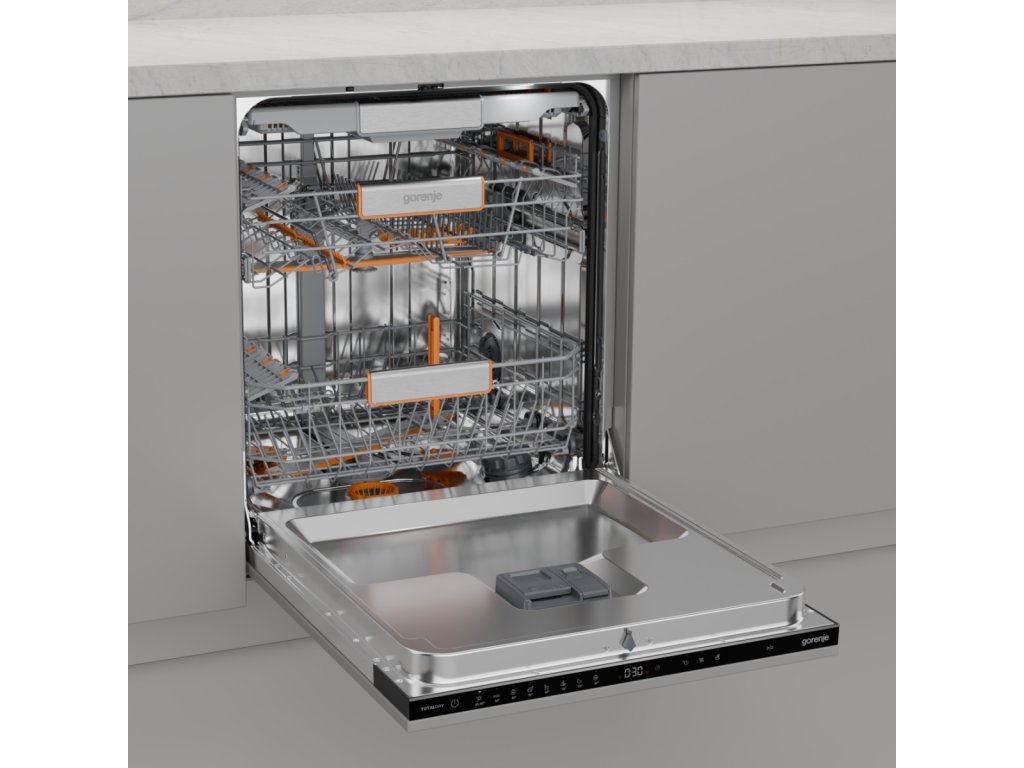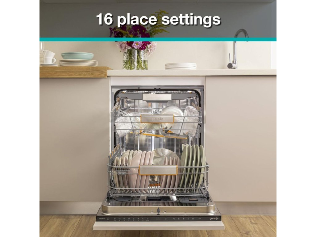 Vestavná myčka nádobí s plně integrovaným ovládacím panelem, šířka 60 cm, kapacita 16 sad nádobí.