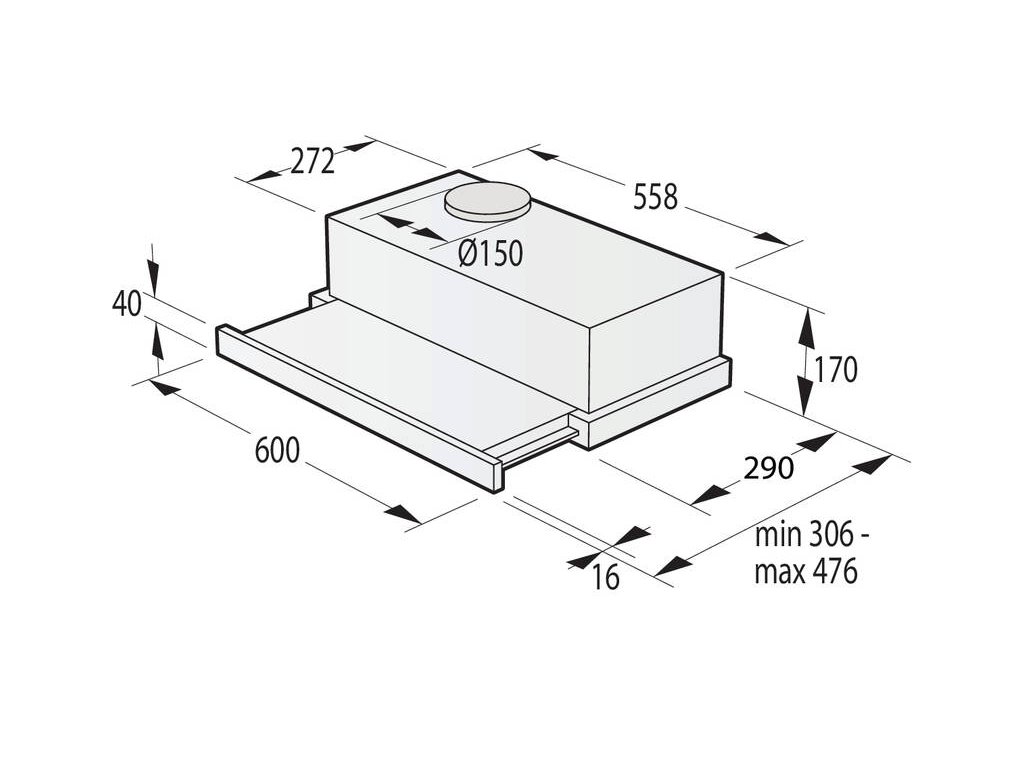 Rozměry odsavače s maximální hlučností 67 dB jsou 60 × 17 × 30,6 cm. Hmotnost této digestoře je 6,8 kg a napájí se na elektrické napájení 230 V. Průměr odtahového hrdla činí 150 mm, což se hodí do jakékoliv kuchyně.