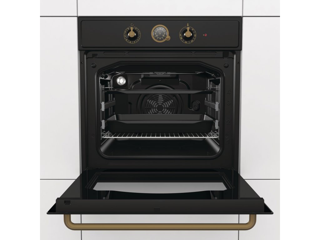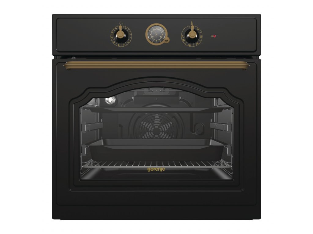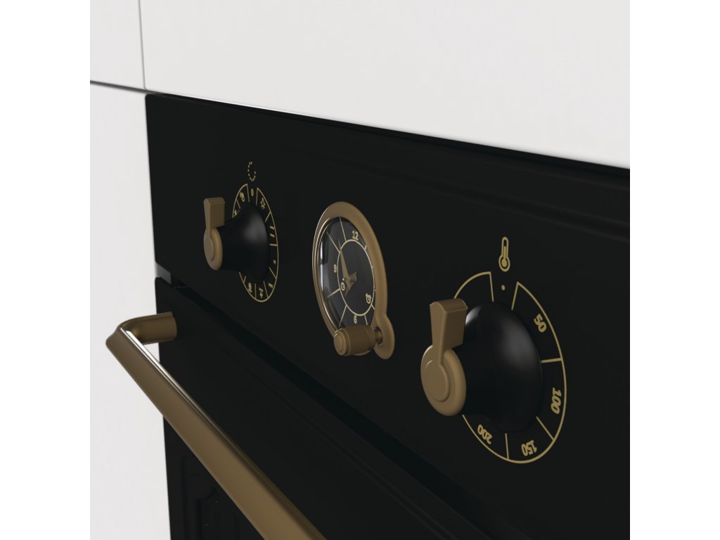 Vestavná trouba Gorenje BO7732CLB je unikátní designový kousek, který se skvěle hodí do stylových kuchyní. Svým vzhledem nadchne každého, kdo vstoupí do kuchyně. Design ale není to jediné, čím se tento model může pyšnit. Chloubou je také extra velký vnitřní prostor trouby 71 litrů, který vychází z tvaru kamenné pece. Trouba pracuje v energetické třídě A. Teplota a hodiny se nastavují otočnými knoflíky, vše je tedy intuitivní a přehledné. Trouba také nabízí vnitřní osvětlení, které dopomůže k vizuální kontrole nad chystanými pokrmy. Velice snadné otevírání a zavírání umožňuje ergonomický zlatý úchyt.